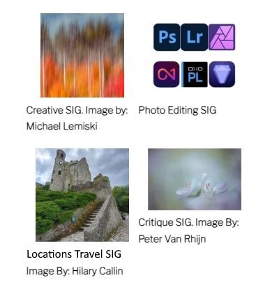 Each SIG meets once a month via Zoom, from September to July. Meetings are on a Monday at 7 PM. However, the Locations Travel SIG meets on a Tuesday. Please check the Club Calendar for specific dates for each SIG.